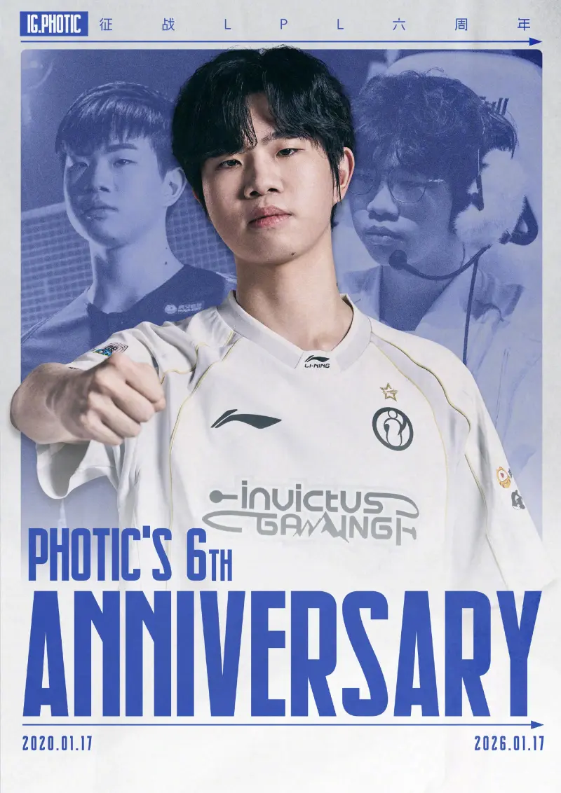 虎扑01月17日讯 今日是IG下路选手Photic登场LPL六周年,IG为其送上祝福,具体如下: