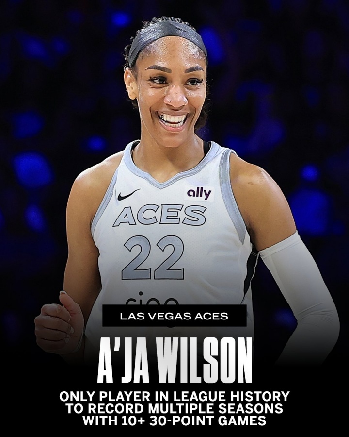 这是她本赛季第10次单场得分30+,成为WNBA历史上首位多次达成单赛季至少10场30+的球员。