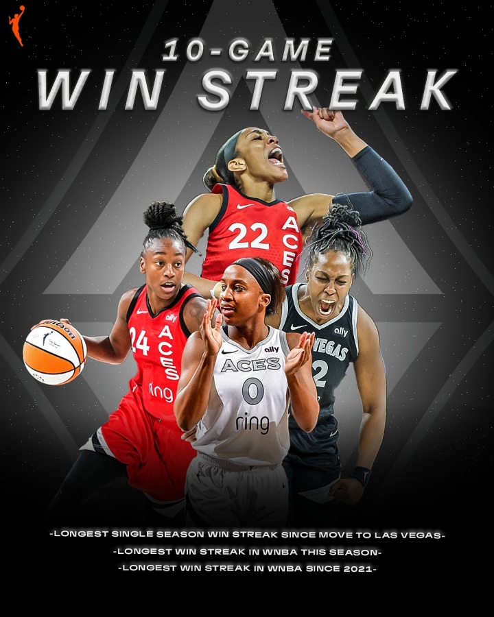 王牌队本次十连胜不仅创下球队迁至拉斯维加斯后的单赛季最长连胜纪录,同时也位列本赛季WNBA联盟最长连胜。